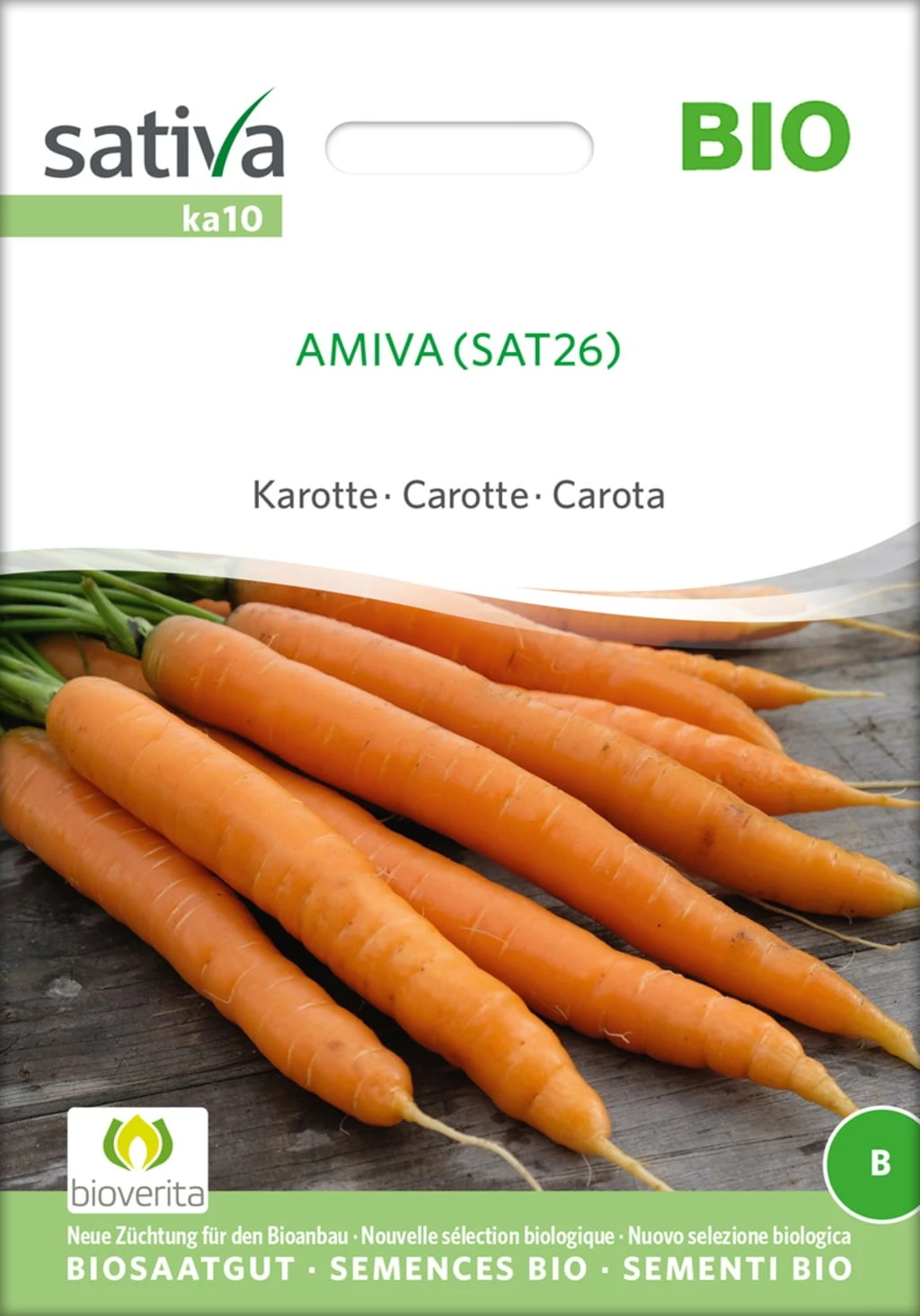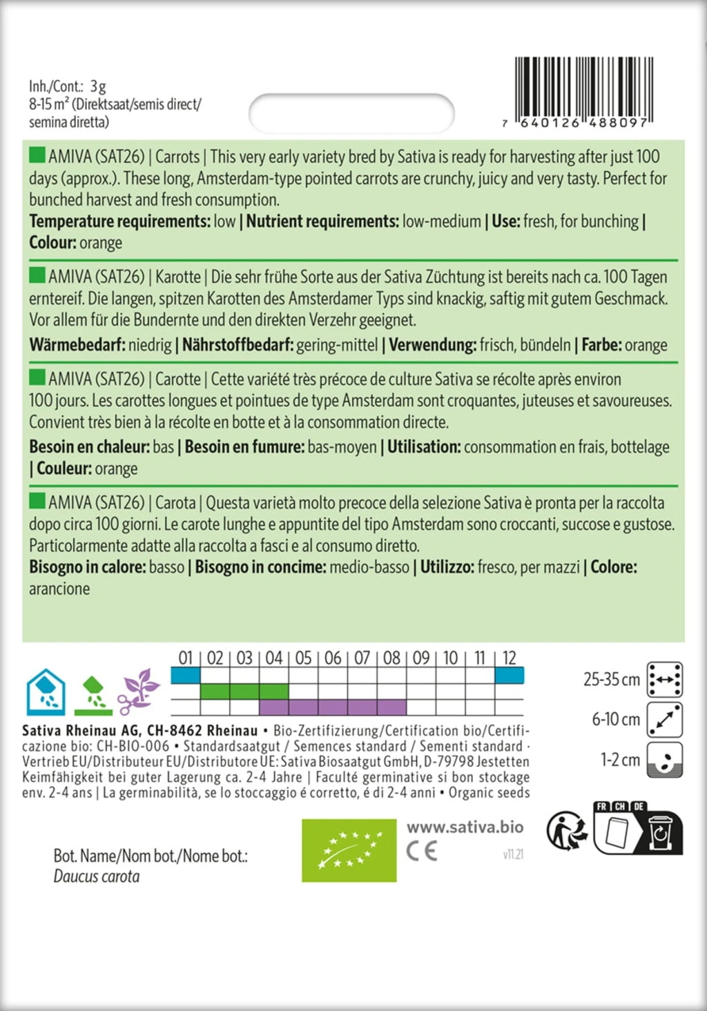 Le carote “Amiva” possono essere raccolte già ad aprile grazie alla loro opzione di semina precoce. Inoltre, la varietà necessita solo di un ciclo di maturazione di 100 giorni. La forma è allungata e appuntita, mentre la consistenza è croccante e succosa.