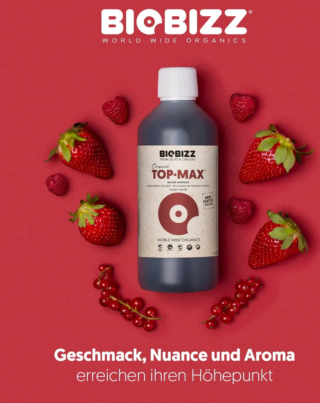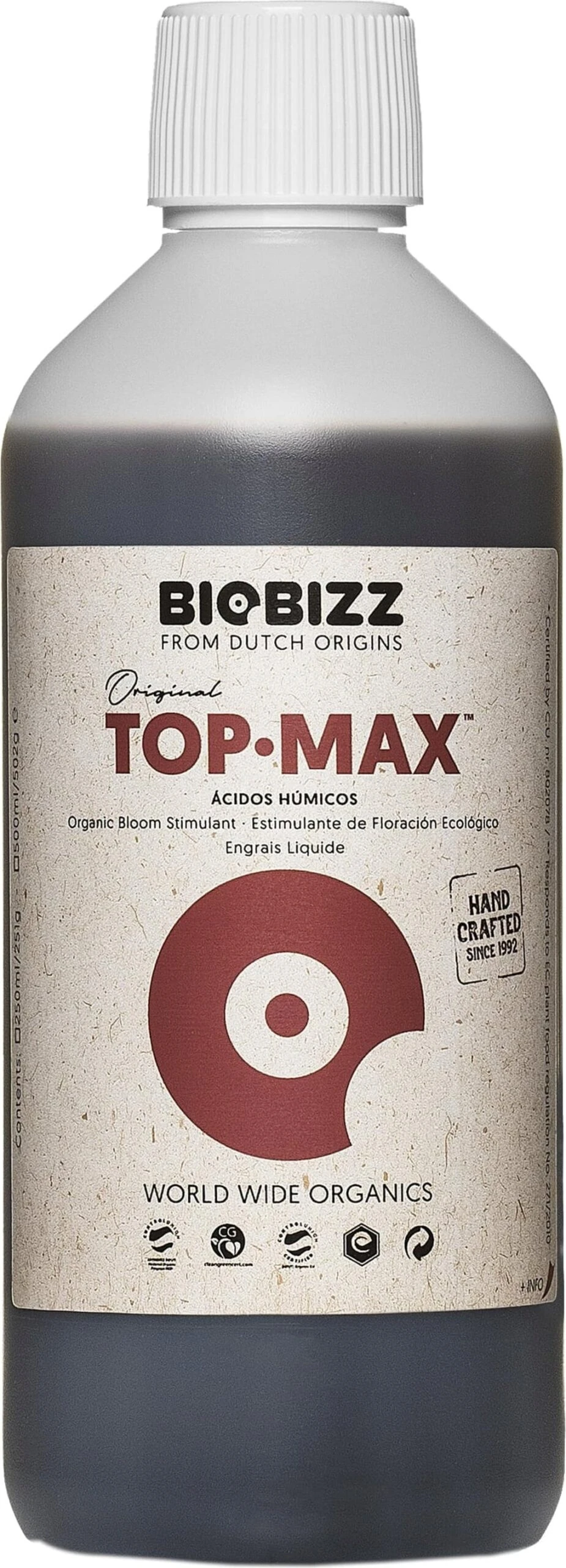 Top-Max è un booster di fioritura organico che migliora significativamente l’assorbimento dei nutrienti. Questo successo si ottiene principalmente attraverso gli acidi umici e fulvici contenuti, che si trovano anche nell’humus. Con la loro carica elettrica, i nutrienti e i minerali necessari vengono liberati dal suolo e dai fertilizzanti organici utilizzati. Insieme, questi due acidi rafforzano l’energia nelle vecchie cellule vegetali e hanno un effetto stimolante sulla loro rigenerazione.